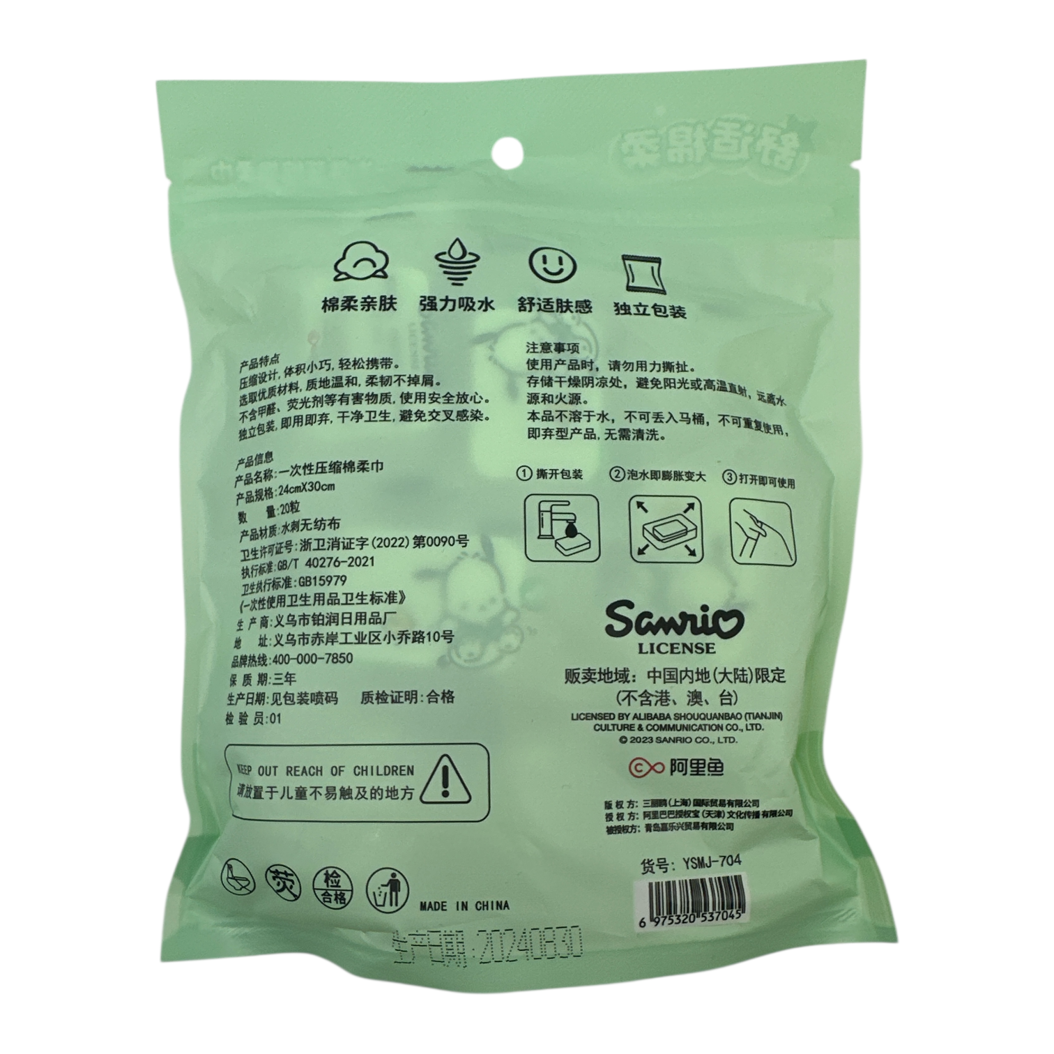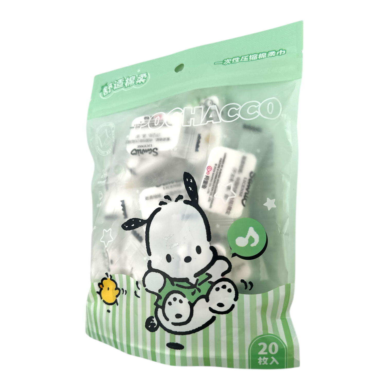 Contains 20 compressed tissues in green Hello Kitty packaging